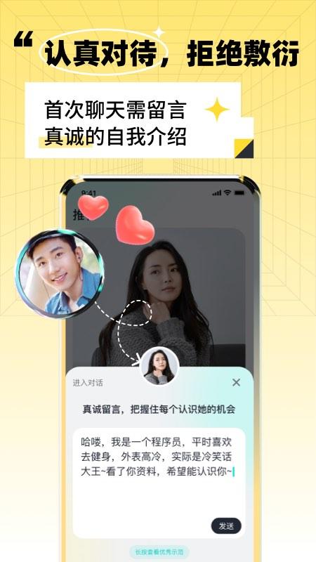 如果你因为事情忙或者圈子小,而找不到属于自己的心动信号,来「靠近」吧,每个渴望爱的人,都值得被认真对待。我们每天将为你推荐适合你的异性,也鼓励对方向你发出真诚的自我介绍,所有美好的故事,都从「靠近」开始吧。