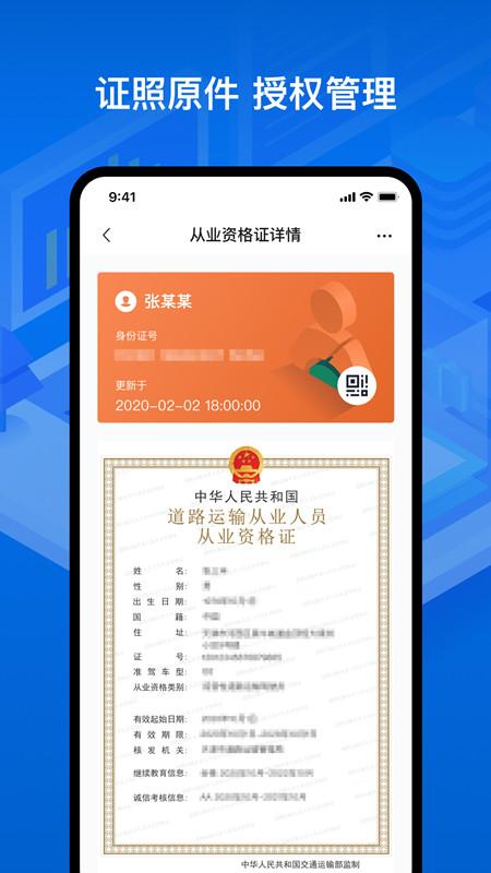 用户使用本软件经过实名认证和证件申领后,即可在移动端展示相应证照,完成道路运输证件由纸质、IC卡介质到电子版的转化。