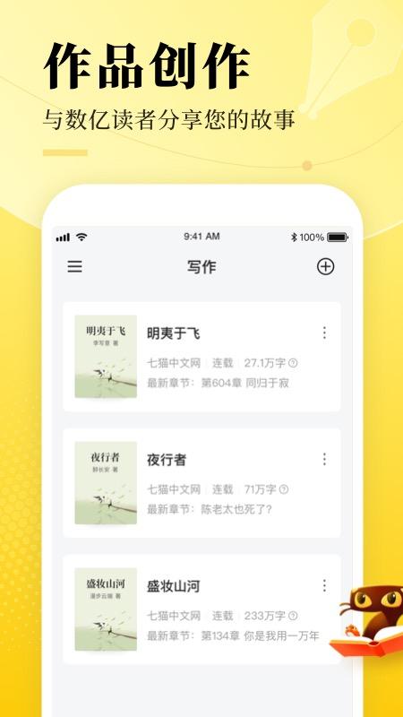 作品创作:支持创建作品,便捷发布、修改章节、保存草稿
