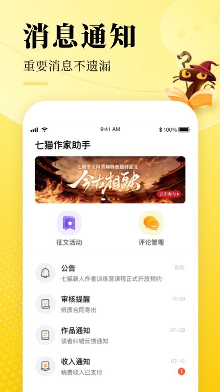 消息通知:支持查看公告、审核提醒、作品通知、收入通知、征文活动等重要消息通知