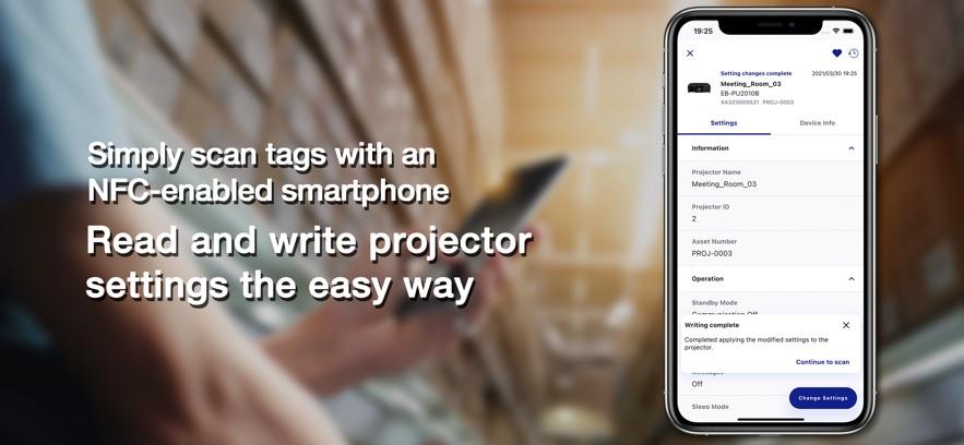 您只需将运行此应用程序的iPhone®放在NFC标签上,即可读取或写入投影仪设置信息。NFC写入可以通过设置密码来保护,这样只有设备管理员可以更改设置。