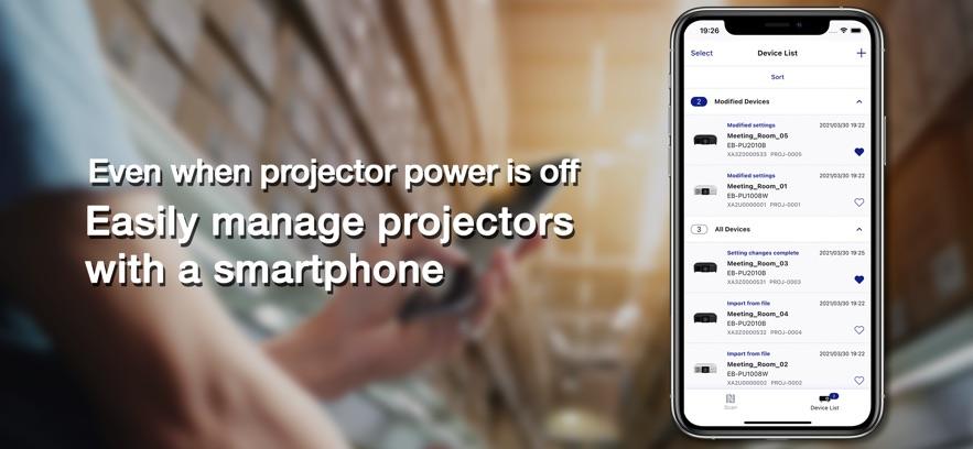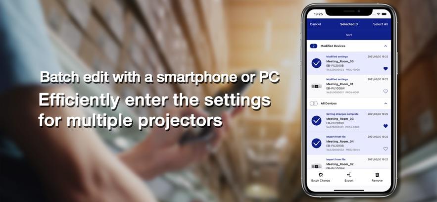 您可以使用该应用程序批量更改多达1000个投影仪的设置,并将iPhone®放在每个投影仪上的NFC标签上进行应用。此外,您可以导出CSV文件,使用电子表格软件编辑多个投影仪信息,然后将其导入应用程序以更改投影仪的设置。