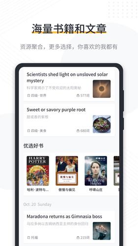 1、每天都会推荐实时的英文资讯,聚合各大网站的英文资料,支持分级阅读,按照高中英语,英语四级,英语六级,考研,雅思,托福等难度等级分类,适合各英语爱好和学习者。