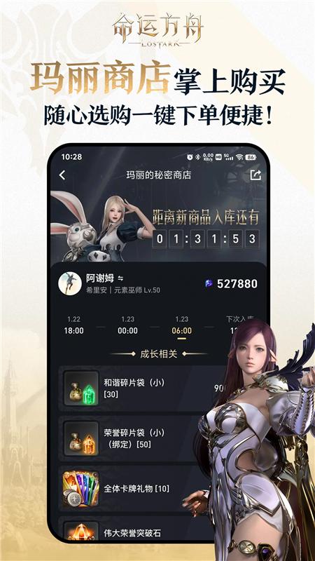游戏内【玛丽商店】功能也已加入掌上命运方舟,冒险家可在方舟APP中查看玛丽商店的刷新时间,消耗蓝钻购买商店内的物品。APP内的物品刷新时间和游戏内刷新时间一致哦~