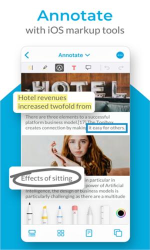 3、注释和评论:支持高亮、下划线和删除文字。可以插入线条,箭头,圆形,多边形或绘制手绘。还支持更改颜色,大小,透明胶片等。