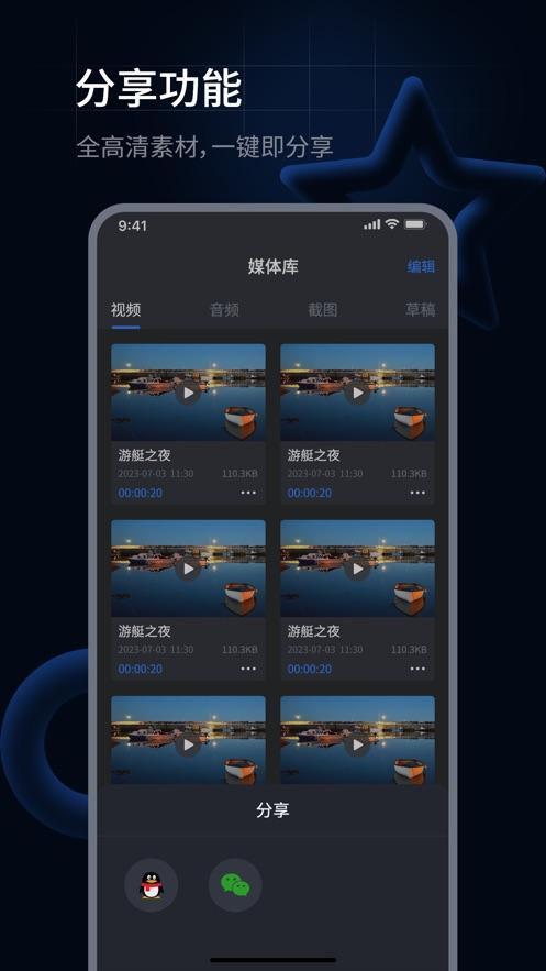 剪辑,分割,变速,配音,配乐一步到位,录制完立即剪辑,还有视频压缩,视频倒放等更多好用功能。