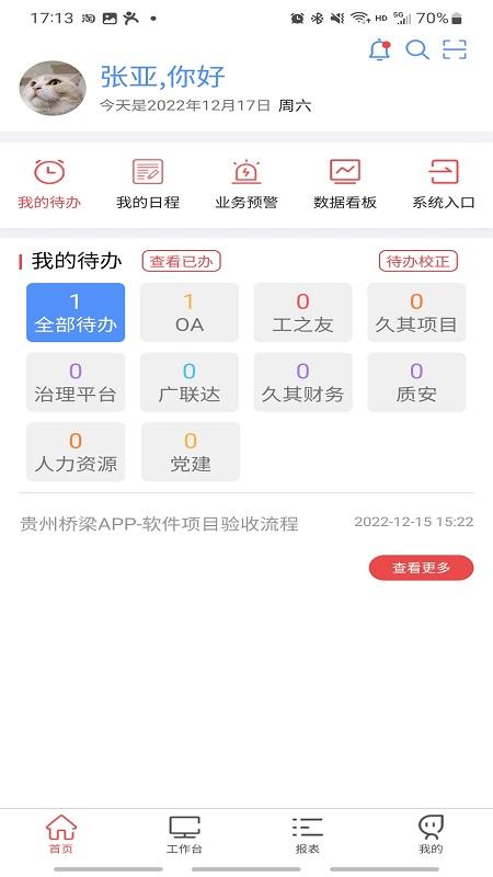 贵州桥梁App是专为贵州桥梁建设集团有限责任公司制作的一款移动协同办公应用,软件拥有首页,工作台,报表,我的等板块,包含了我的待办,我的日程,业务预警,数据看板,报表管理等等丰富功能,可以帮助员工更智慧高效移动协同工作,需要的朋友欢迎前来下载使用。
