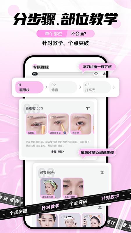 循序渐进,步步为营!采用分步骤、分部位的教学模式,将复杂的化妆过程拆解为简单易懂的小节,带你逐步攻克美妆路上的“小怪兽”,快速升级。