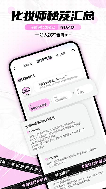 揭秘美妆界的独门秘笈!课代表已就位,为你整理好详尽的美妆笔记,汇总课堂内美妆技巧,可随时随地回顾复习。