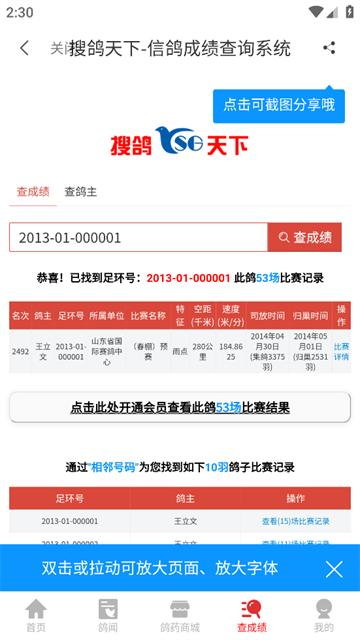 【成绩查询】 搜鸽天下是一家做赛鸽足环查询的网站,输入赛鸽足环上的环号,您就可以知道这羽鸽子的所有成绩信息,所有的成绩都来源于的赛鸽公棚,赛鸽俱乐部,信鸽协会发布的权威数据。