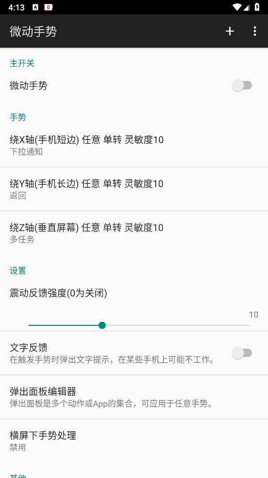 1、支持沿三个轴的旋转手机动作,可自定义动作。缺省绕X轴(手机短边)旋转为下拉通知,绕Y轴(手机长边)旋转为返回,绕Z轴(垂直于手机屏的轴)旋转为多任务。