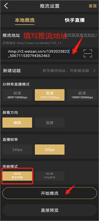 3、填写推流地址,然后选择直播分辨率、屏幕方向、帧率和传输模式等等,最后点击【开始推流】即可;