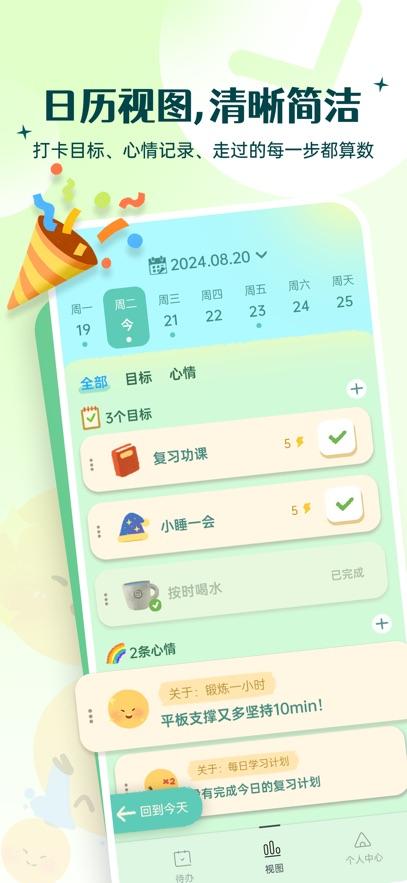 1. 打卡设置:满足日常各类目标设定,如早起、饮水、运动等,更可自定义标签。