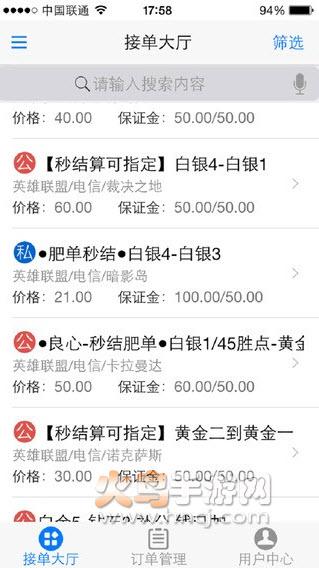 2.如果选择订单,可以根据游戏类型、区域服务和价格过滤订单。