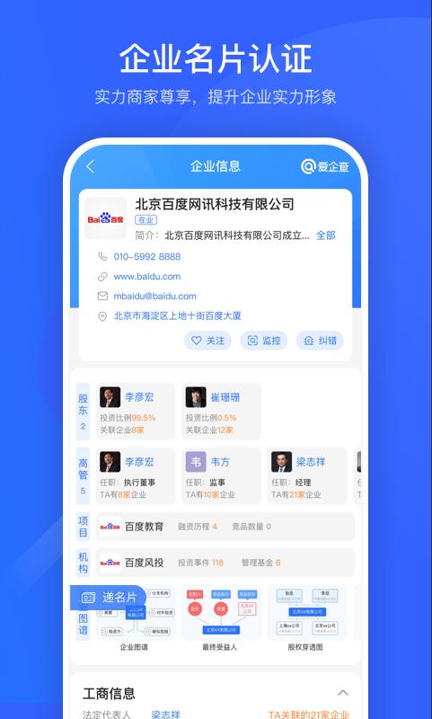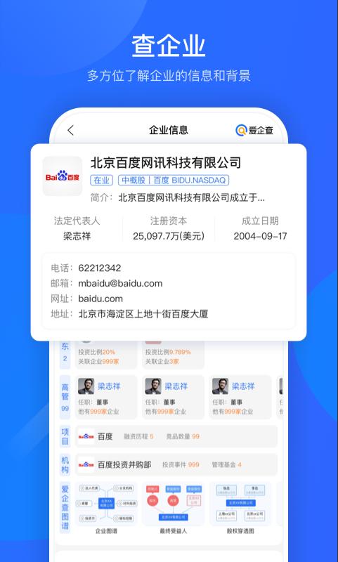 爱企查app依托百度强大的大数据和AI技术,用户可以一键查询企业所有工商信息、股权结构、商务纠纷,免费获取企业真实经营状况!