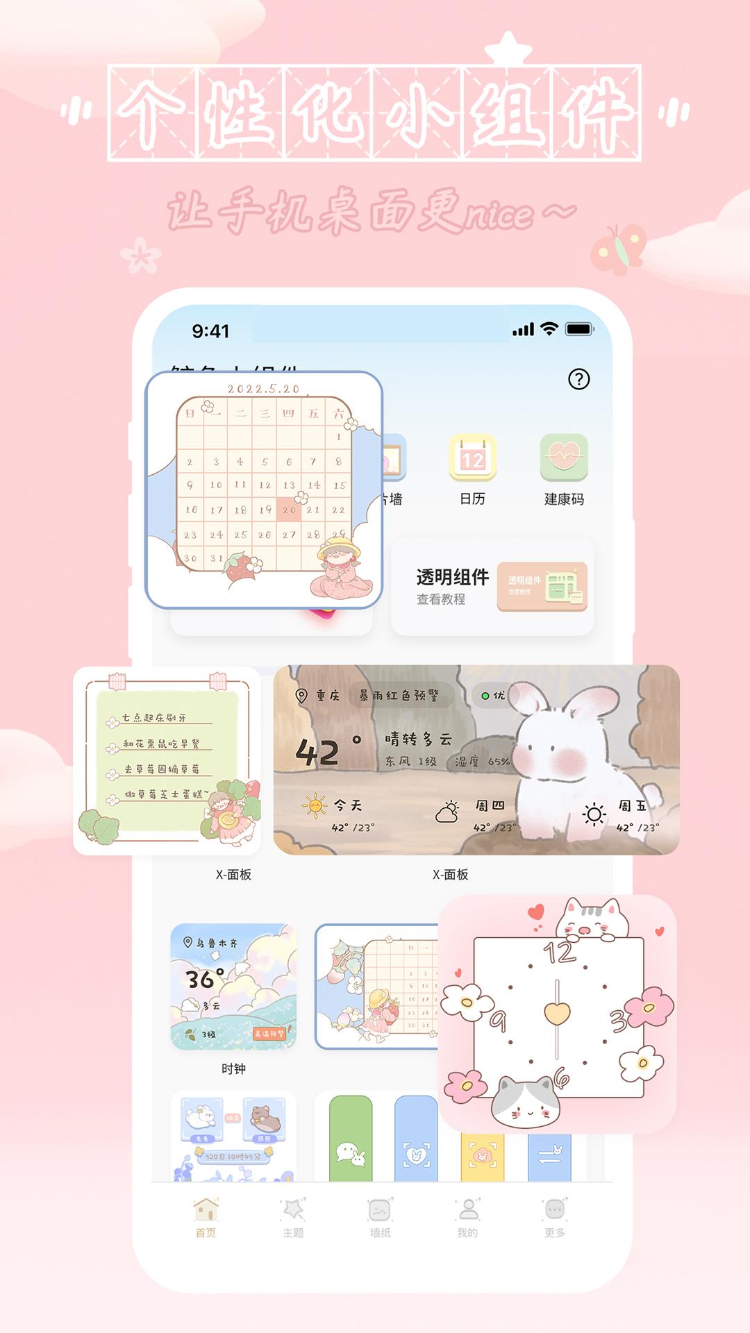 电量郁金香兔兔、X面板、动态组件、照片墙卡框、心情日志、打工喵、搬砖日历、兔与熊纪念日、恋爱纪念日、月兔倒数日、月桂兔时钟、太空人时钟、动物森林天气;