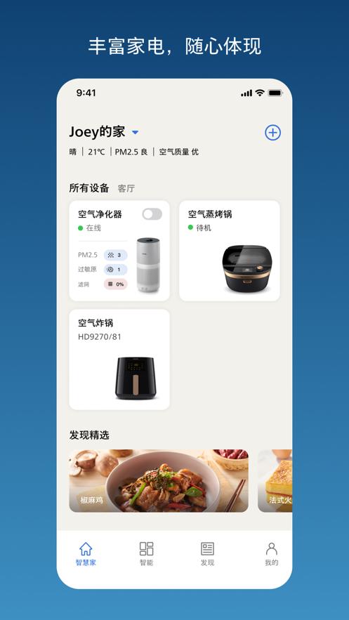 飞利浦智慧家APP为您提供智慧生活解决方案,将您家中的高品质飞利浦家电智能设备与手机相连,便于您轻松操控。