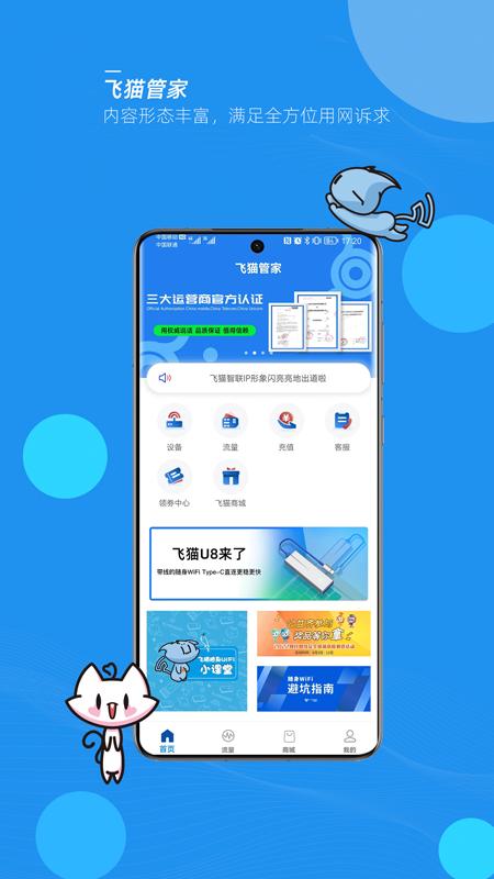 飞猫管家是专为4G/5G移动通信设备打造的一款集快速实名认证、设备管理、流量充值、流量查询、精品购物、客服支持于一体的专用功能性软件,