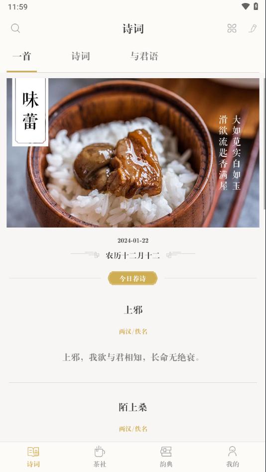 古诗词典app下载正版是一款手机古诗词软件,软件拥有诗词,茶社,韵典,我的等等功能板块,可以帮助用户更好的阅读学习诗词,喜欢诗词的朋友可千万不要错过。