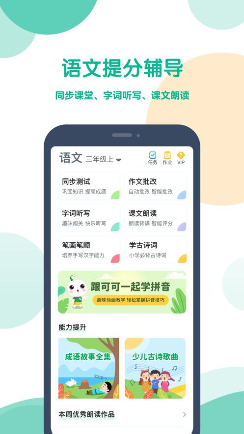 1、课本点读:同步最新部编版语文教材、纯正发音、智能评分。