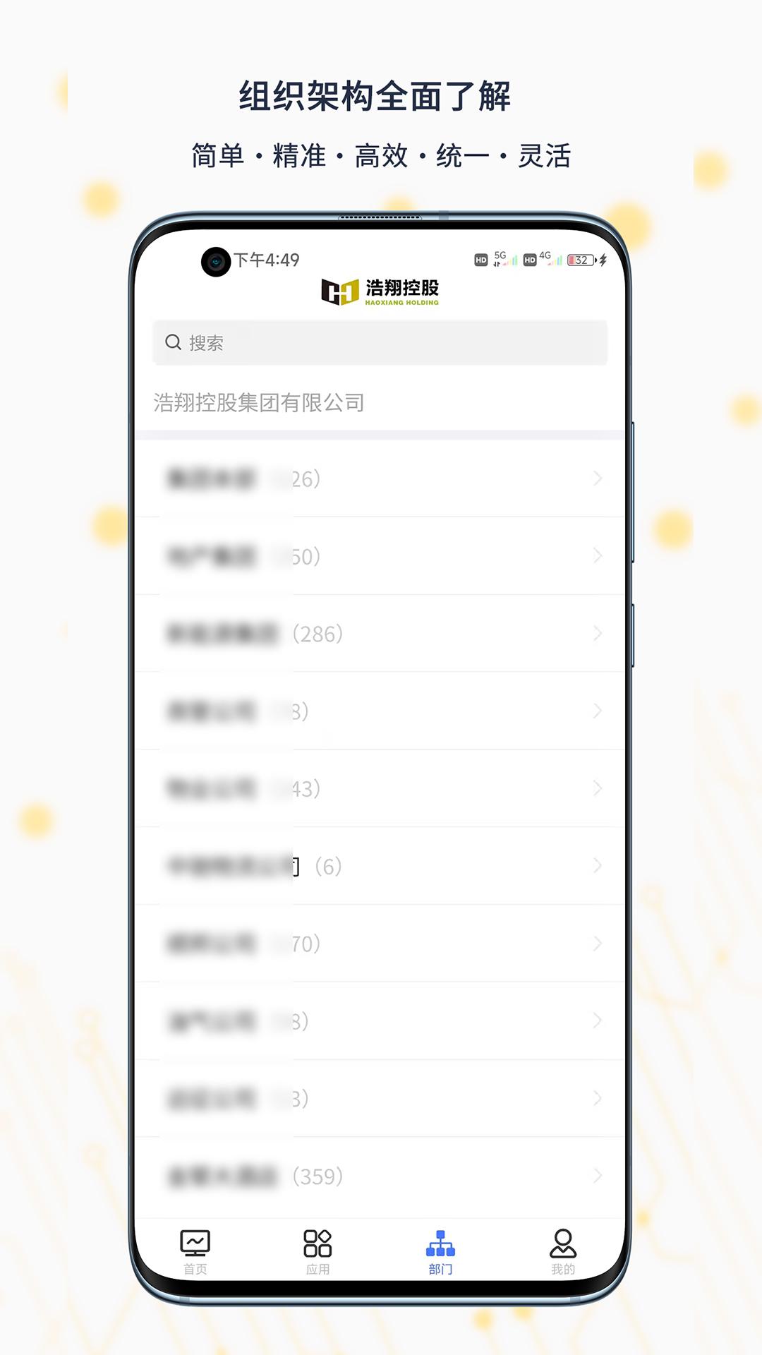 智慧浩翔app是浩翔控股集团有限公司官方倾情推出,软件拥有首页,应用,部门,我的等功能板块,可以帮助用户更好的移动协同高效工作。