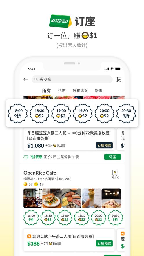 搜寻餐厅、于你喜爱的餐厅订座,出席后赚Rice Dollars当钱使!出席订座后,每位可赚$1(受条款及细则约束)。 Rice Dollars当钱使适用于外卖自取、餐饮券、订座预付套餐及OpenRice Pay埋单比钱。