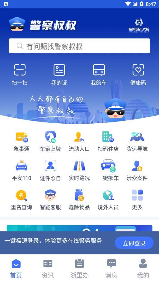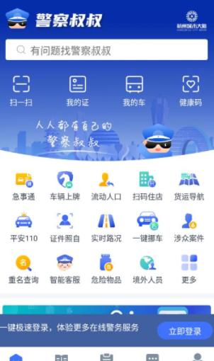 警察叔叔app是浙江省杭州市公安局面向全体市民推出的一款智慧警务服务APP,涵盖车管业务、信息服务、出入境、人口管理四大类,共二十项业务。