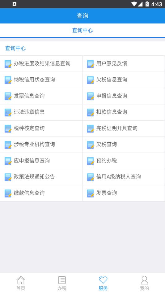 查询中心提供了办税进度、缴款信息、欠税信息、发票信息、申报信息、违法违章信息、信用状态等七项涉税事项查询服务;