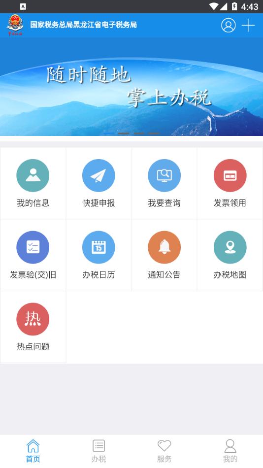 集成了国家税务总局黑龙江省税务局网上业务及服务,使纳税人在移动端感受高效便捷服务。