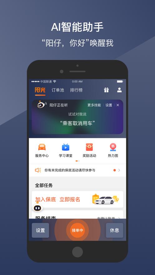阳光出行车主端App为签约司机和车队的服务端,司机能通过此应用接单、抢单、派单、出车时间、出车车辆、相关认证且自我展示以及实现工资的结算与提现等。