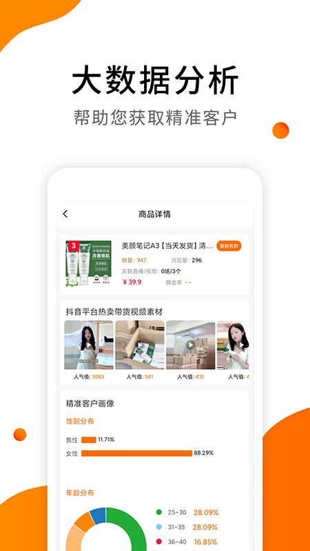 4、每个商品都有具体的数据分析,标注了适合的客户群体画像,让带货不盲目。