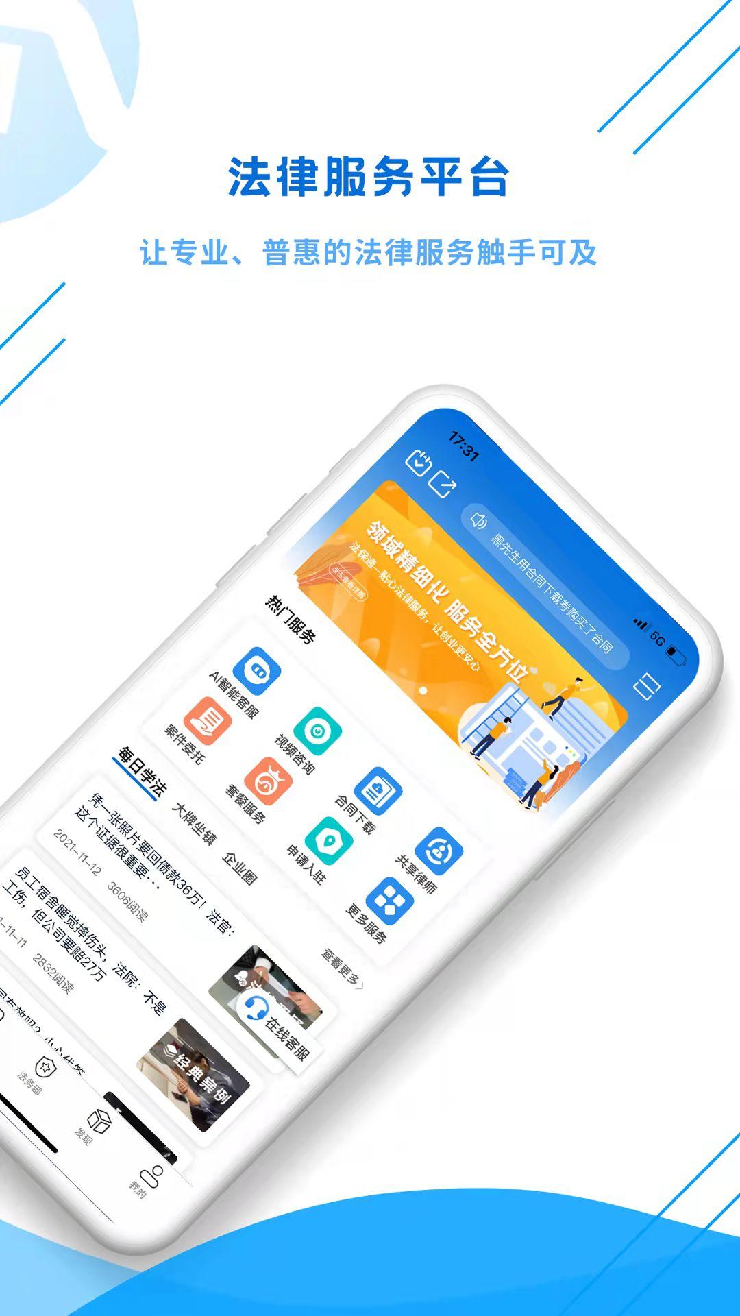 更有合同下载、代写文书、律师视频咨询、管家服务、线上法律讲座、企业圈等更多功能等你解锁!赶快下载体验吧!
