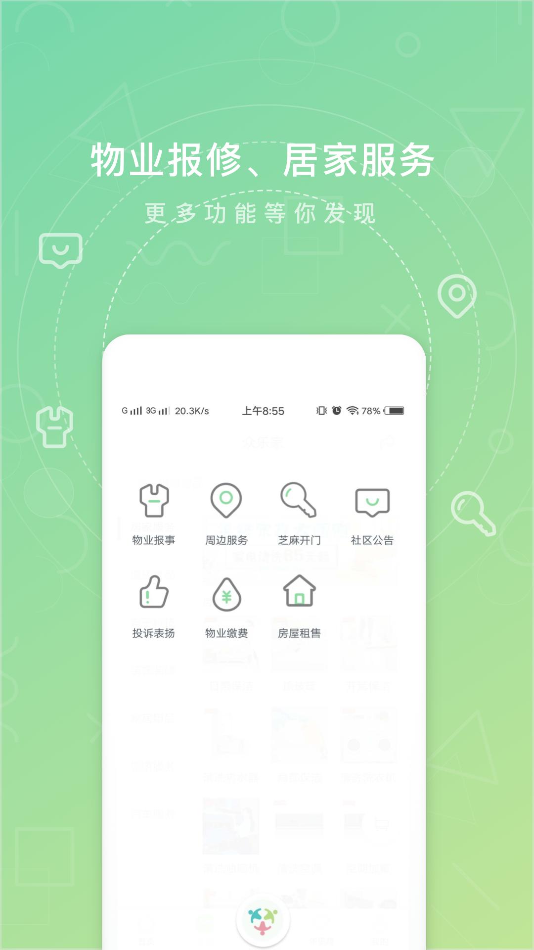 众乐家APP是格众科技自主研发的智慧服务移动应用。以物业报事、芝麻开门、投诉表扬、社区商城等服务,为业主生活带来方便、快捷与满意。