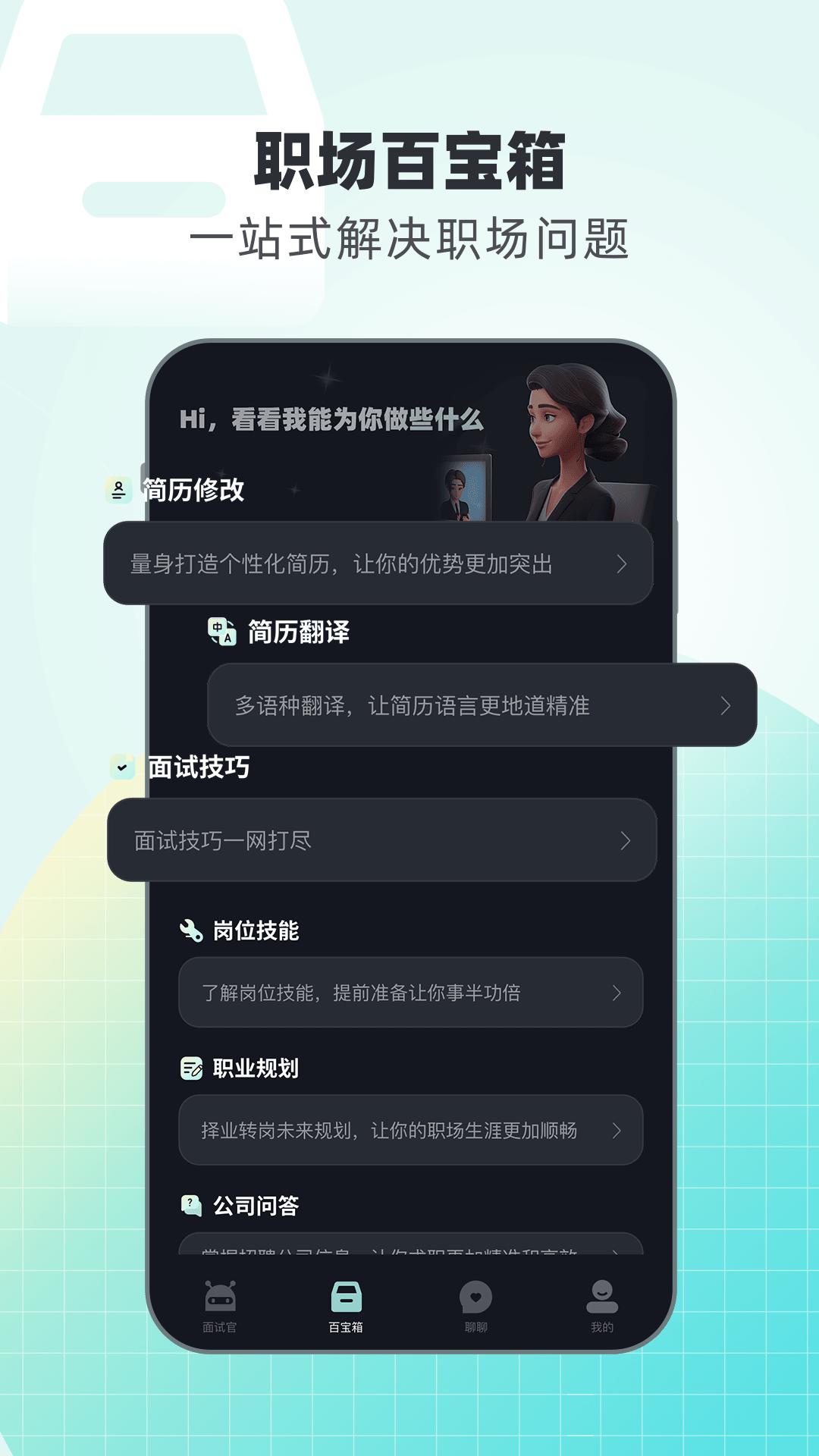 「百宝箱」在这里我们为你提供一站式职场问题解决功能,如:生成和修改简历、提高面试技巧和岗位技能等。帮助你解