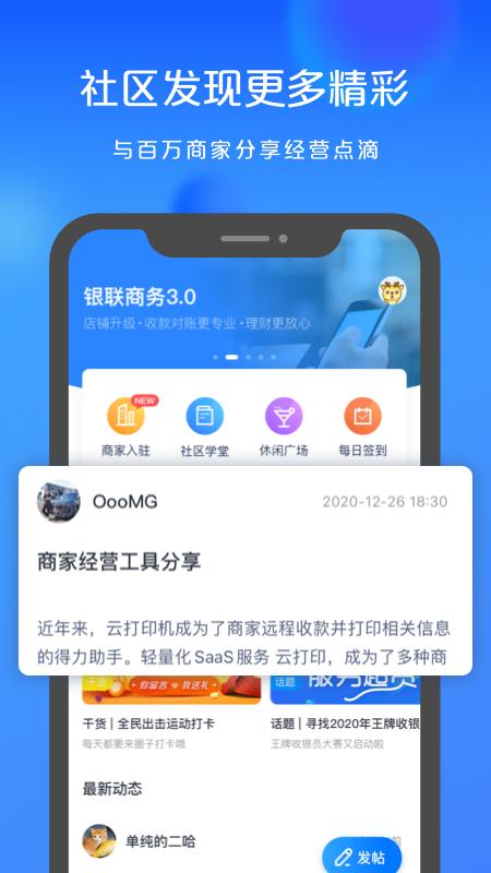银联商务app是一款由银联商务股份有限公司开发打造的O2O商户综合服务平台。提供便捷收款服务支持多种方式收款,经营数据一目了然。还有更多活动福利等你体验。