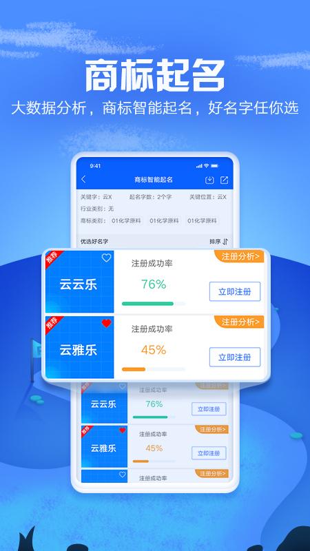 商标起名:用户可选择根据行业、关键词等信息,智能生成合适的品牌名称,解决用户起名难的问题;