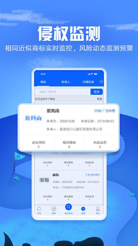 商标进度查询APP是一款集商标查询、商标注册、商标交易、商标风险监测、商标起名、专利查询和政策服务为一体的产品,为解决目前用户对商标申请以及专利申请提交后,无法及时获悉相关信息专门研发的深度应用,同时深入了解用户的痛点,集成商标起名,商标分析报告等特色功能。