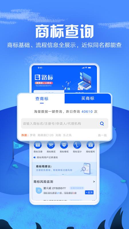 商标查询:用户可以根据商标名称、申请号、申请人、代理机构等多维度查询,获取更详细的商标信息;还可根据商标分类标准选择商标应注册的类别;用户可以查看商标公告,及时获知商标审核情况;