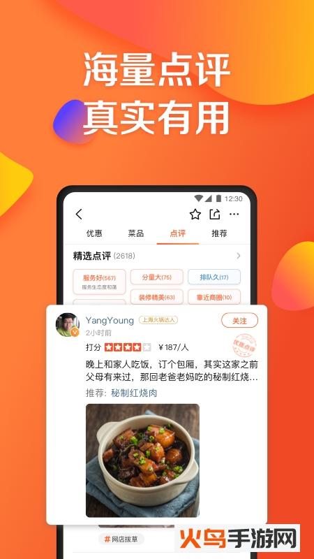 大众点评网app是全球最早的消费点评网站,致力于提升消费者的生活质量,提供值得信赖的本地商家、消费评价和优惠信息,包括优惠套餐、旅游、酒店、外卖、电影、演出、美食、打车、美发、美容、医美、KTV、预约、预订、订座、外送、电子会员卡等生活信息服务,dianping,现在更覆盖了丽人、结婚、亲子、购物、宠物、培训、家装、周边游、出境海外游、生活网、车辆查违章等几乎所有本地生活服务行业.现在还有超级明星张艺兴、关晓彤、江疏影、朱亚文、胡彦斌、沈月在大众点评分享自己的潮生活!