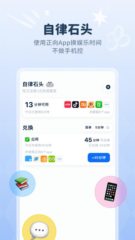 自律石头软件是一款帮助用户可以更加自律的时间管理软件,大家可以使用这款软件设定手机应用的使用时间,时间到了就不能使用应用,更好的帮助大家戒掉手机瘾,但是你可以通过自己的资自律来换取时间,比如看书、跑步运动等等方式都可以换取娱乐时间。更好的帮助用户健康生活。