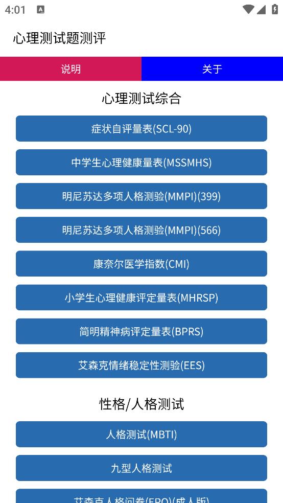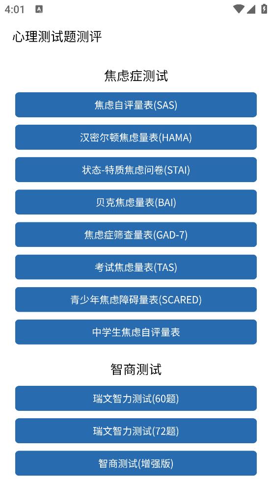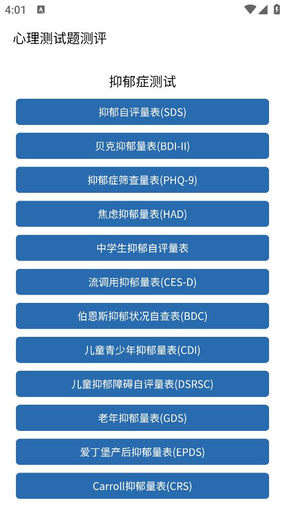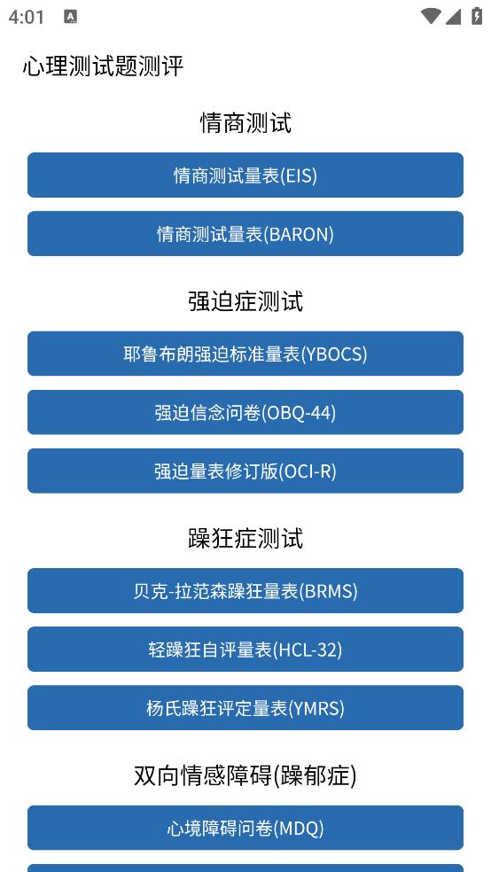 主要包括:抑郁测试、焦虑测试、人格/性格测试、智商测试、情商测试、强迫测试、躁狂测试、双相情感障碍测试等。