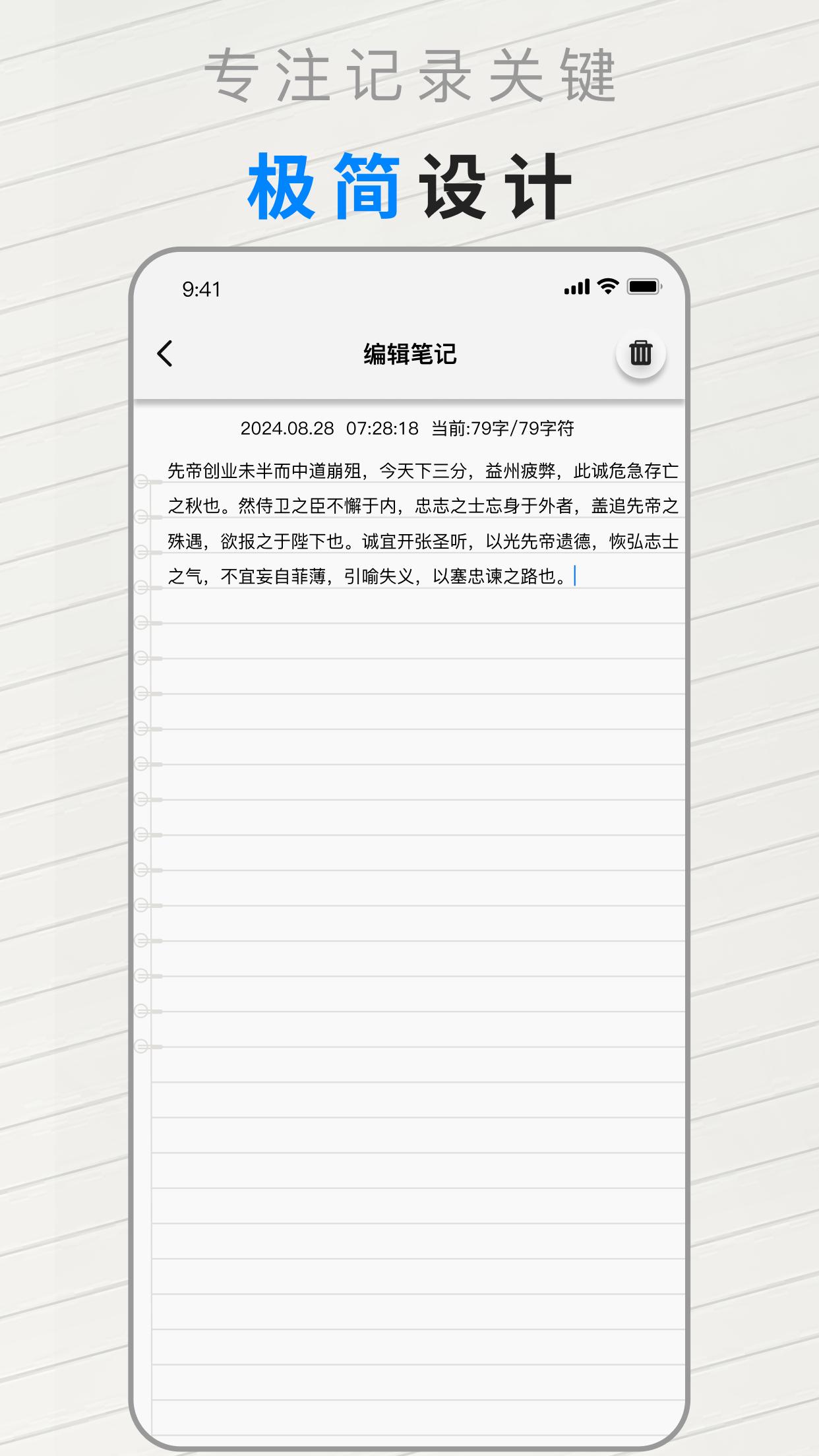 这是一个专门帮助你轻松记录灵感和日常生活的小工具,无论是在工作、学习还是生活中,这款应用都能成为你管理笔记的得力助手。它以极简设计为核心理念,同时提供了强大的功能,让每一位用户都能高效、便捷地记录和整理自己的笔记内容。