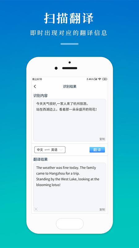 照片翻译:智能锁定图片或场景中的文字信息,自动提取后翻译成多国文字,可自由变换语言种类。