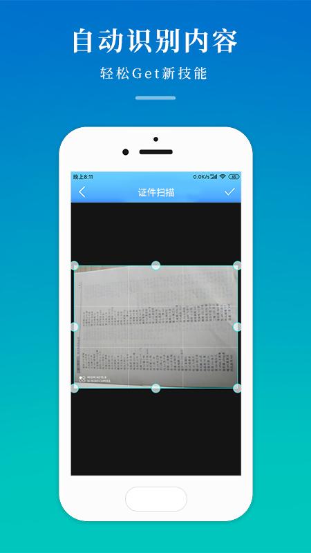 身份证扫描:身份证正面和反面智能拍照,生成高清照片,随拍随用。