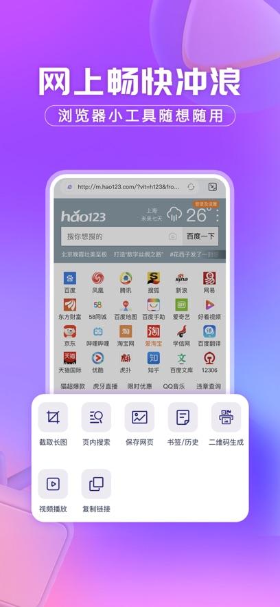 通过浏览器功能,用户可以通过搜索或直接输入用户想要的网址,进行互联网内容冲浪。选择自己想要的网页进行网页电影、电视剧等等视频内容的访问,当然也可以观看图文等其他富媒体内容。
