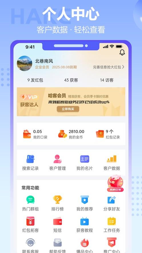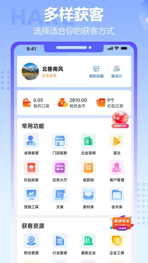 哈客APP通过一张名片和一个红包打通企业快速获客系统包括:红包、名片、CRM、地图获客、工商企业信息、流量集成、流量共享、社交等系统,开创B2S2C模型,让老板、销售员衔接到客户,实现帮助销售员成交、老板获取客户数据和流量资产。