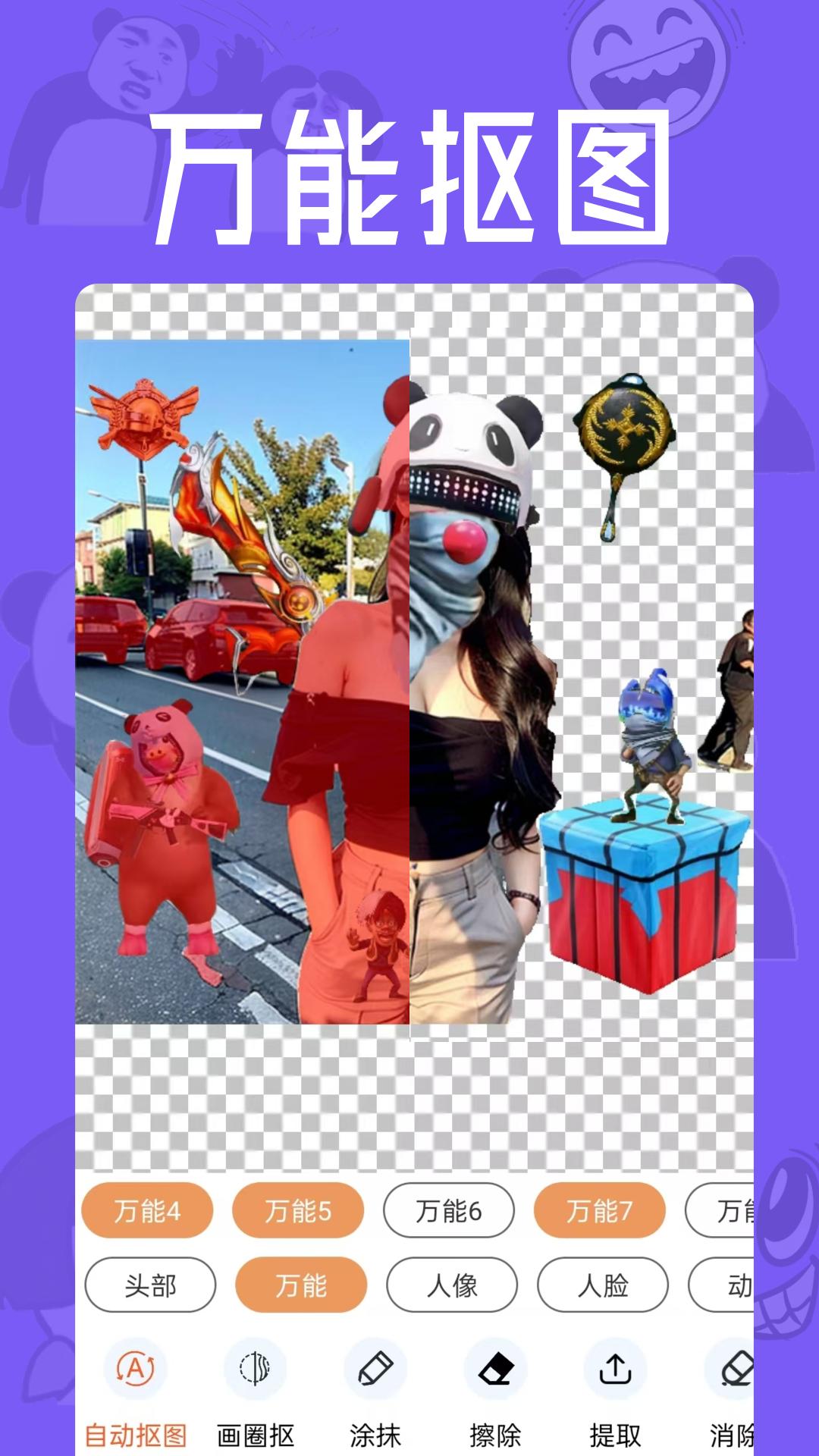 还具备丰富的趣味玩法,比如可以将抠出的人物秒变暴走脸,提供各种丰富搞笑的背景供你随心更换。