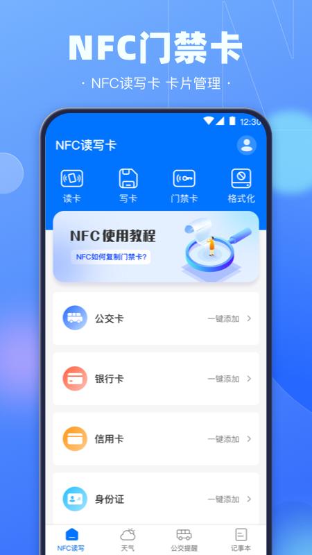 手机nfc复制门禁卡是一款非常好用的智能门禁卡服务软件,用户可以使用这款软件进行智能读取卡片,它的适用范围非常广泛,包括了门禁卡、公交啦、银行卡、身份证等等都可以一键复制所有数据在这款软件上,很好的解决了大家出门忘带钥匙这种情况,感兴趣的朋友赶紧下载试试吧。
