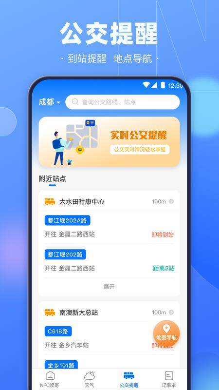 实时公交站牌:车来了车到哪了?公交车还有几分钟到?公交车还有多远?公交实时情况轻松掌握,还可预设响铃提醒;