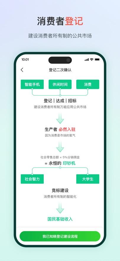 通过消费者汇聚平台学习新知,启发消费者形成认知共识,推进消费者所有制互联网万能应用公共市场的建成,